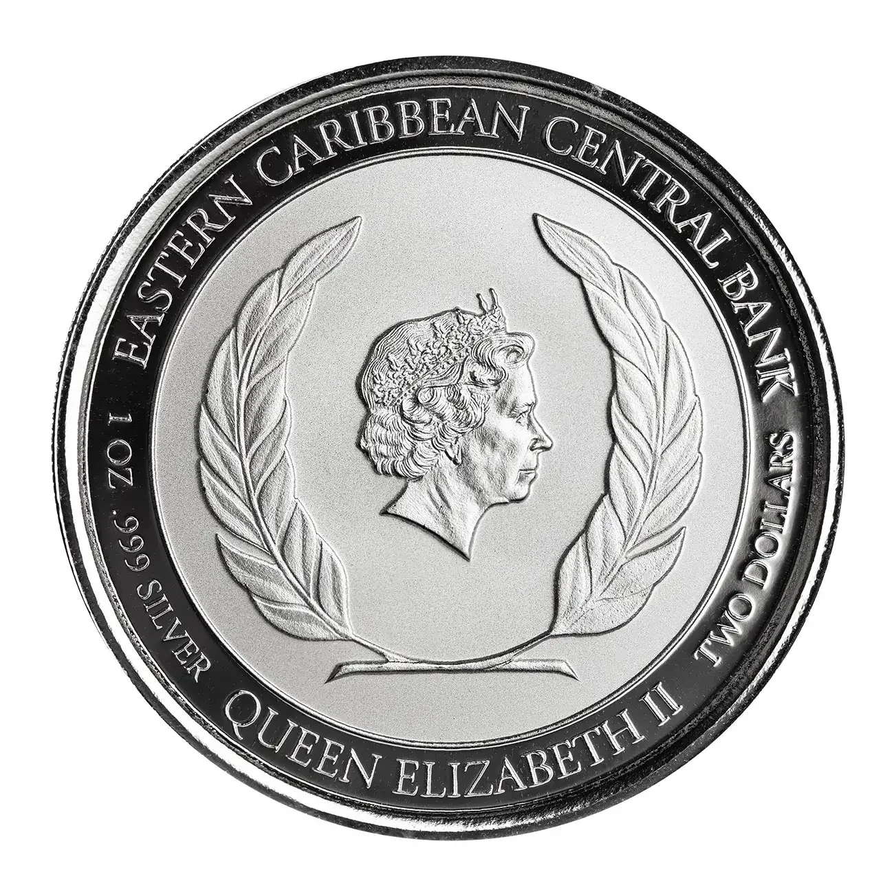 The obverse shows Queen Elizabeth II, framed by laurels, with inscriptions along the rim.