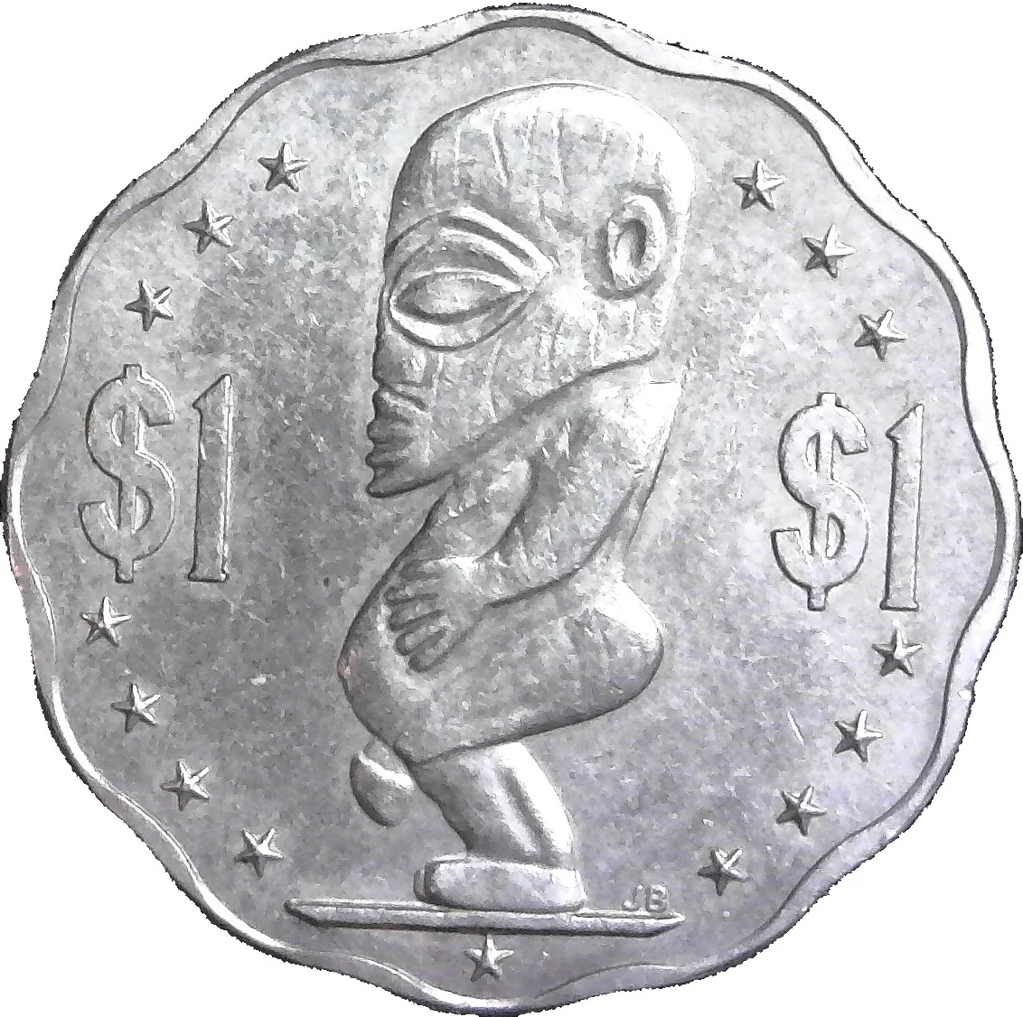 Tangaroa, god of the sea and creation, encircled by fifteen stars for the Cook Islands. This rare tiki divides the denominations.