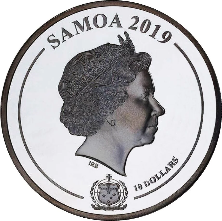 Queen Elizabeth II facing right, with Samoa's coat of arms below.