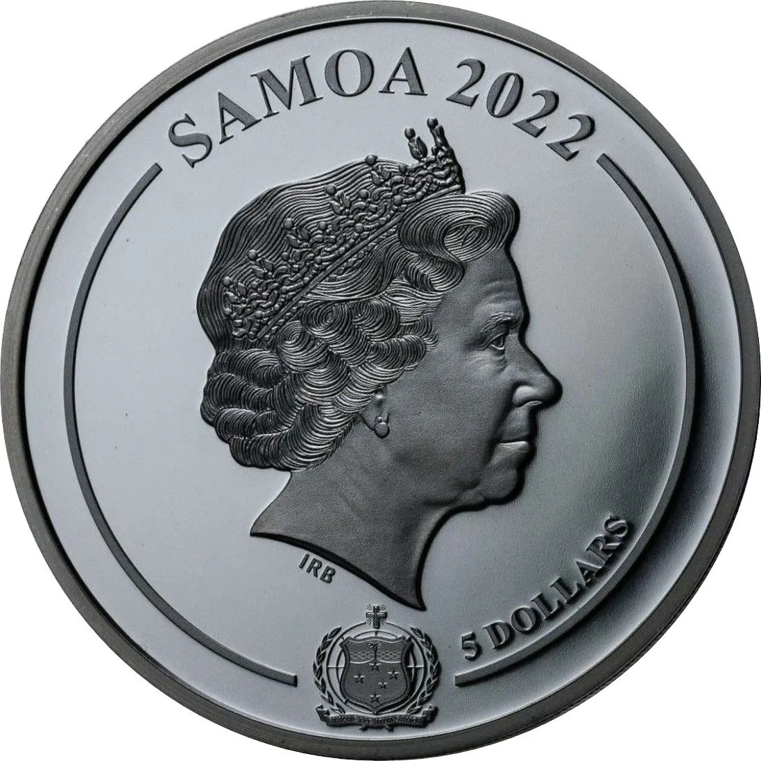 Queen Elizabeth II facing right, with Samoa's coat of arms below.