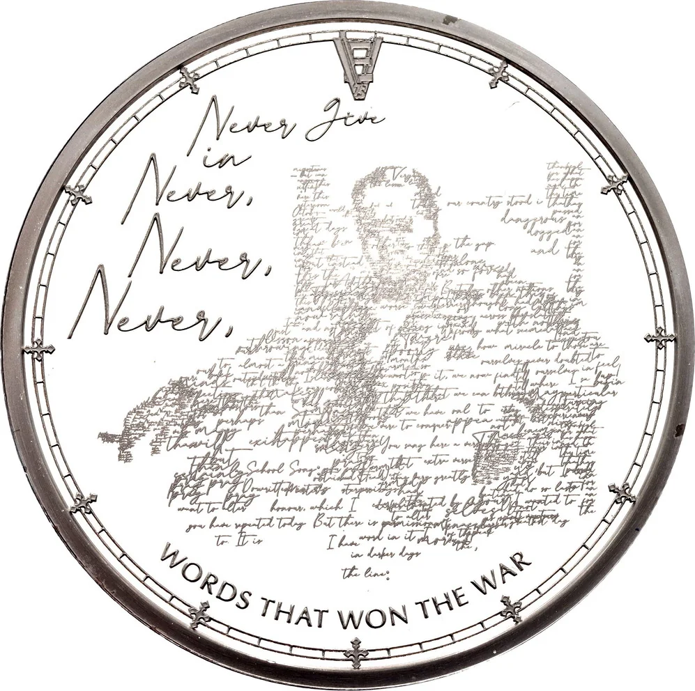 A typographic portrait of Churchill composed from his "Never Give In" speech, with a VE Day emblem at 12:01 on the clock.