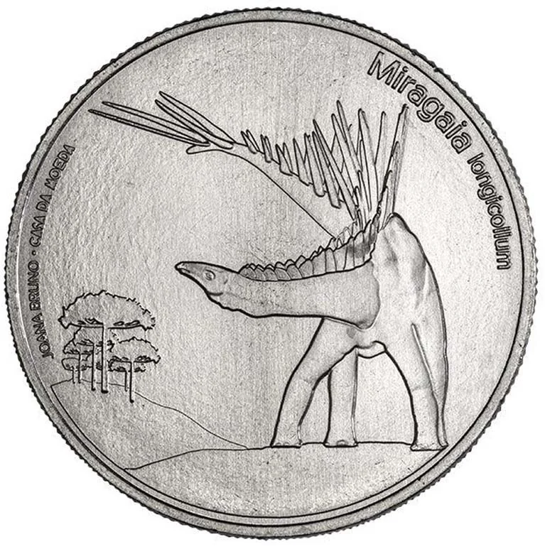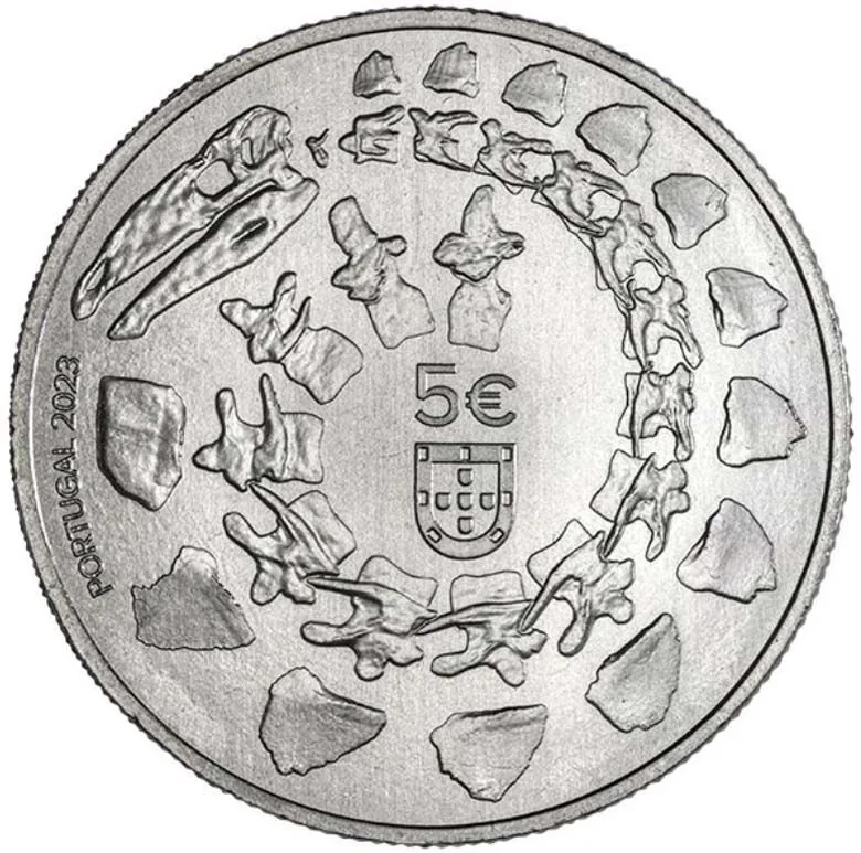 A spiral dinosaur fossil; center with face value and Portuguese coat of arms; left edge reads ‘Portugal 2023’.