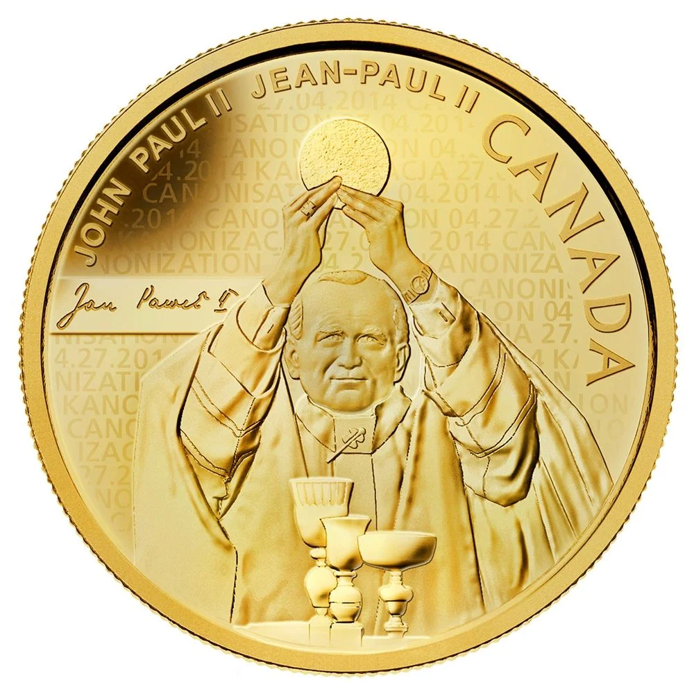 Coin design: artistic interpretation of Pope John Paul II celebrating Mass during his 1984 visit to Canada.
