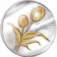 Gold-plated tulip commemorating 50 years of the Netherlands' annual gift of tulip bulbs to Canada, thanking for WWII aid.