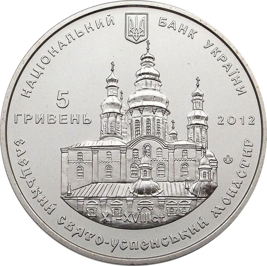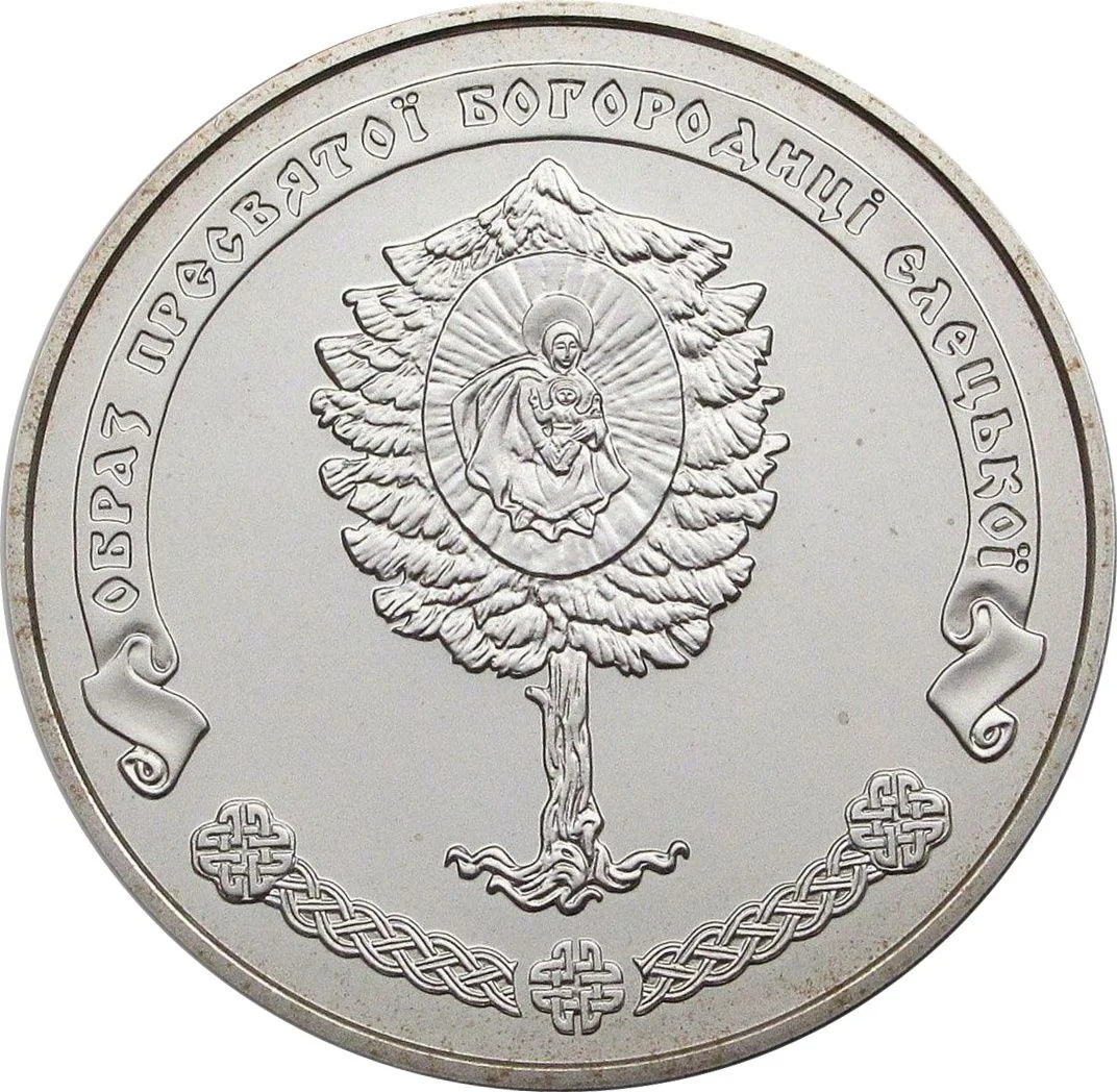 Above: Ukraine's Small Coat of Arms. Semicircular inscriptions: "НАЦІОНАЛЬНИЙ БАНК УКРАЇНИ" (top) and "ЄЛЕЦЬКИЙ СВЯТО-УСПЕНСЬКИЙ МОНАСТИР" (bottom). Center: the Holy Dormition Cathedral (XI-XVIII ст.). Left: face value "5/ГРИВЕНЬ". Right: issue year "2012". Below: the National Bank of Ukraine Mint logo.