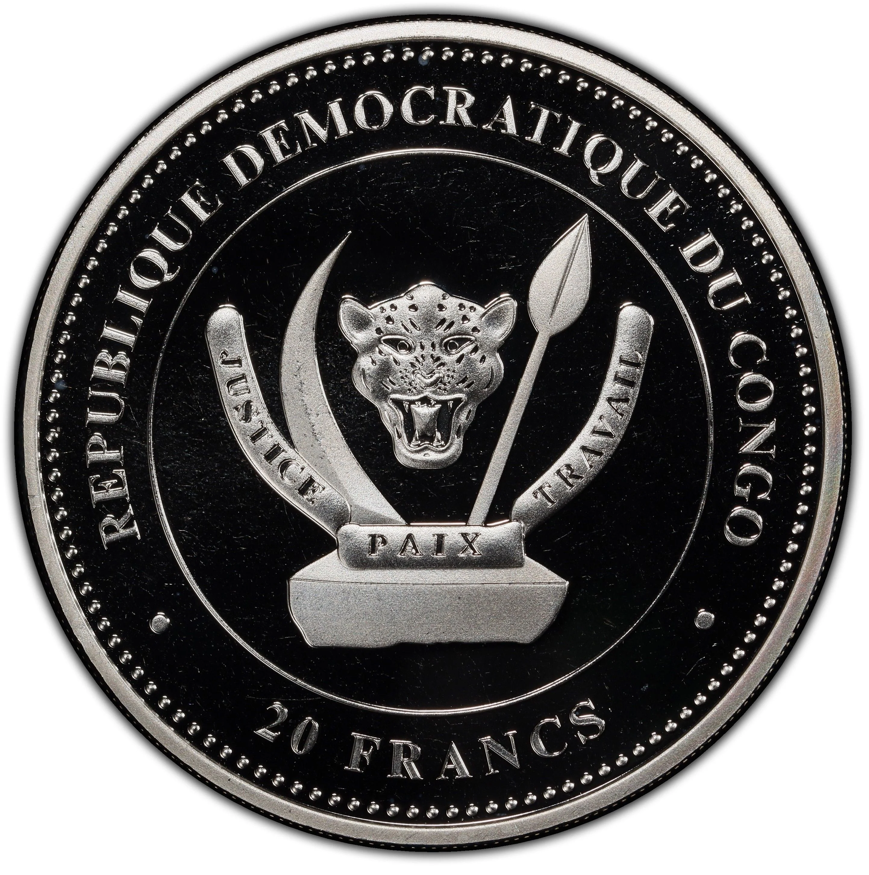 Raised rim, outer beaded circle. Center: Congolese coat of arms above value, within a linear circle.