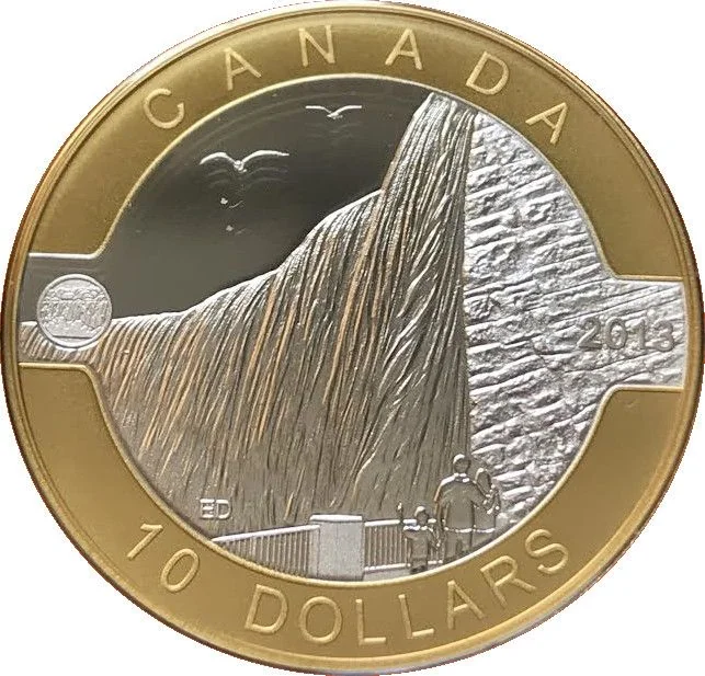 A family stands behind a fence at the base of Horseshoe Falls, viewing the massive waterfall from below. The coin's design includes the Niagara Gorge rock face and two seagulls overhead.