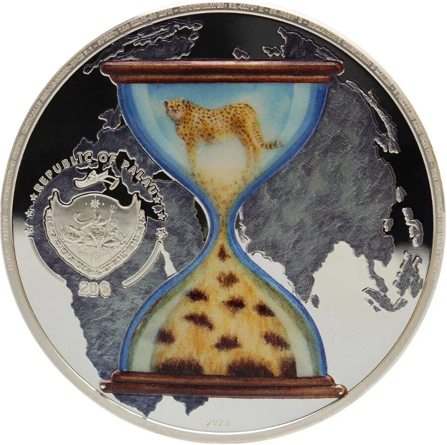 Description: A world map with an hourglass of Asiatic Cheetah-colored sand.