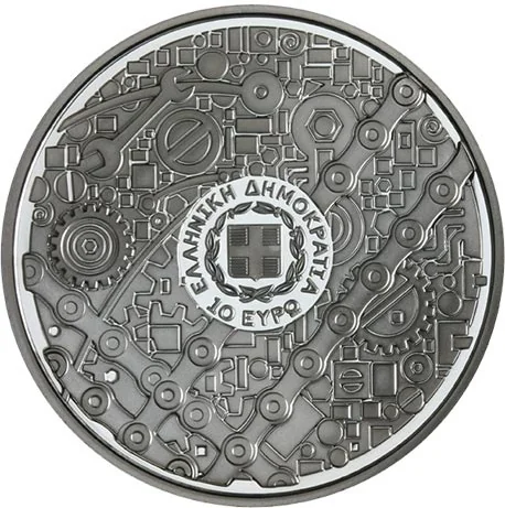 Greece's coat of arms amid tools and mechanical parts.