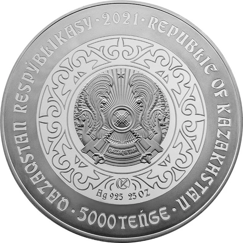 Description: Centered within a national ornament are the coat of arms, the Kazakhstan Mint trademark, and the coin's metal, fineness, and weight. Around the circumference are the inscriptions "QAZAQSTAN RESPÝBLIKASY" and "REPUBLIC OF KAZAKHSTAN." The year "2021" is at the top, and the denomination "5000 TEŃGE" is at the bottom.