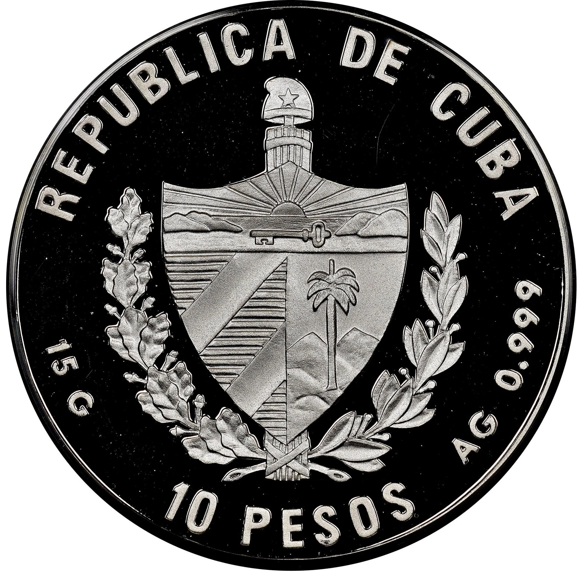 Cuban coat of arms, country name above, face value below, weight and fineness on sides.