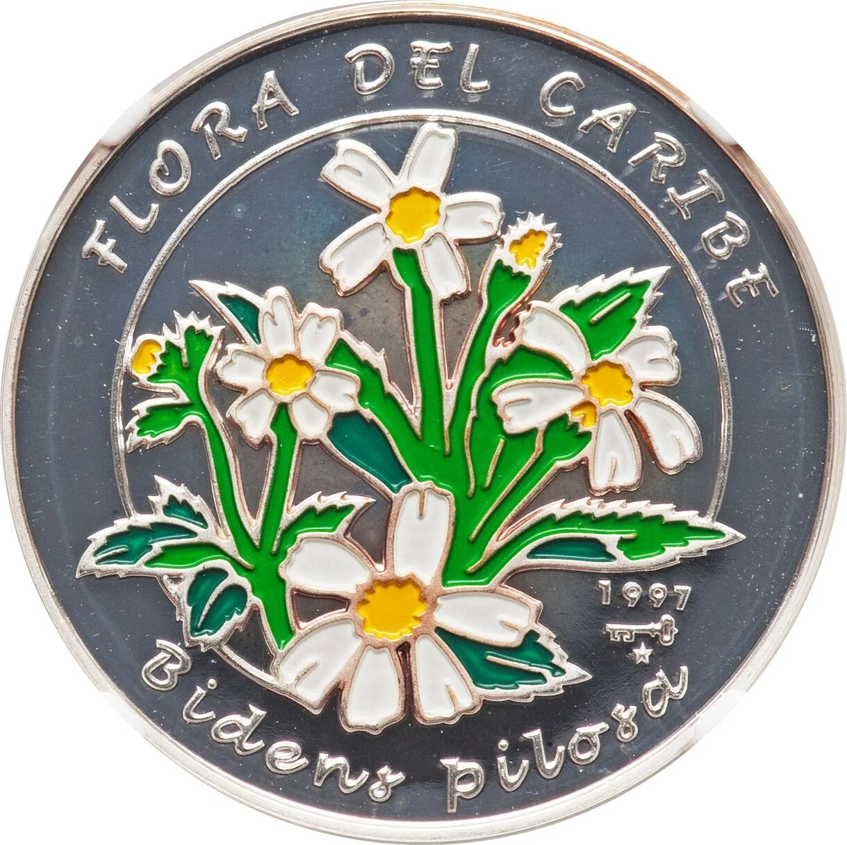 Romerillo (Bidens Pilosa) multicolor flowers. Curved series above, plant name below, mintmark and date at lower right.