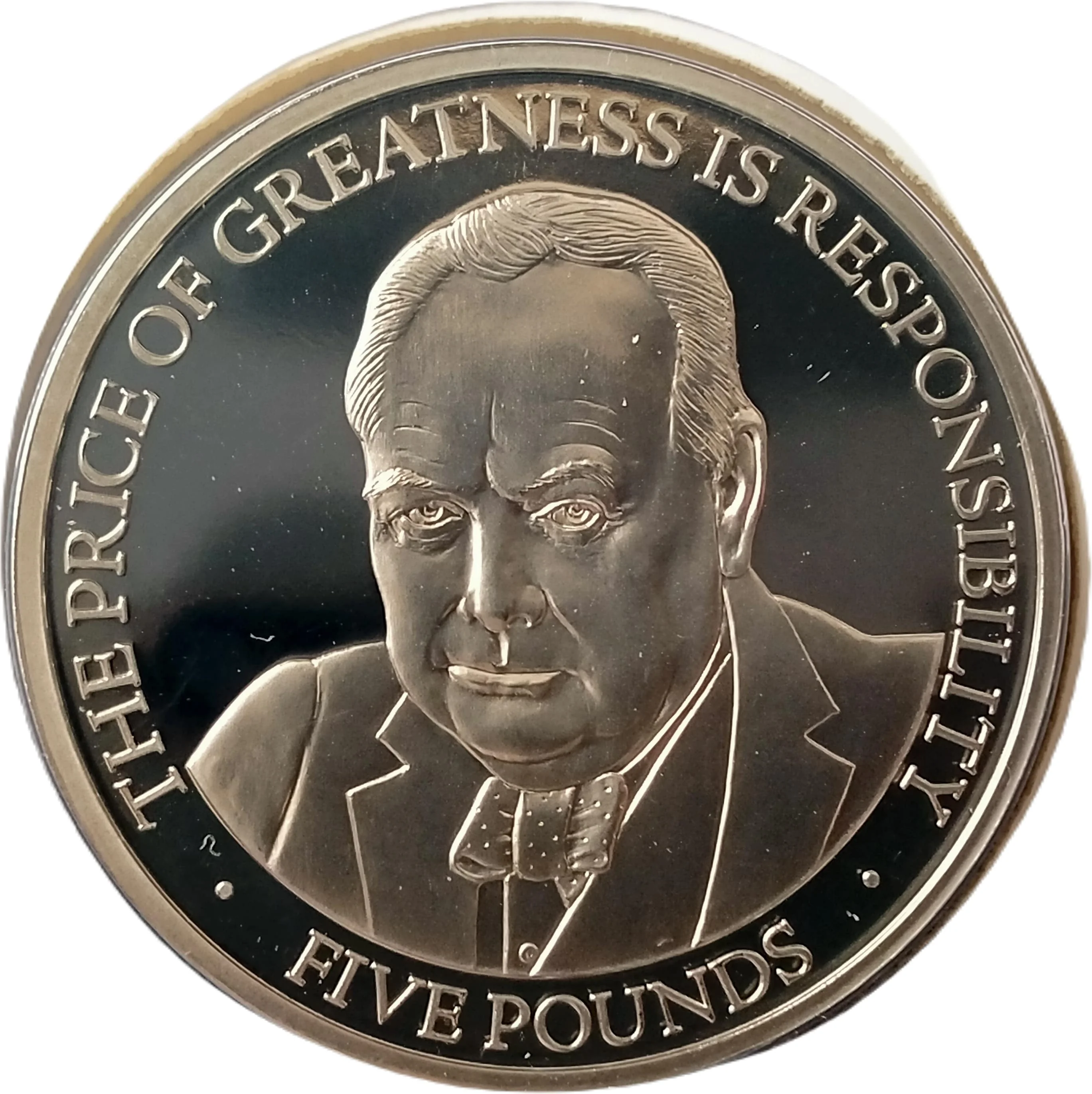 Churchill bust with encircling legend.