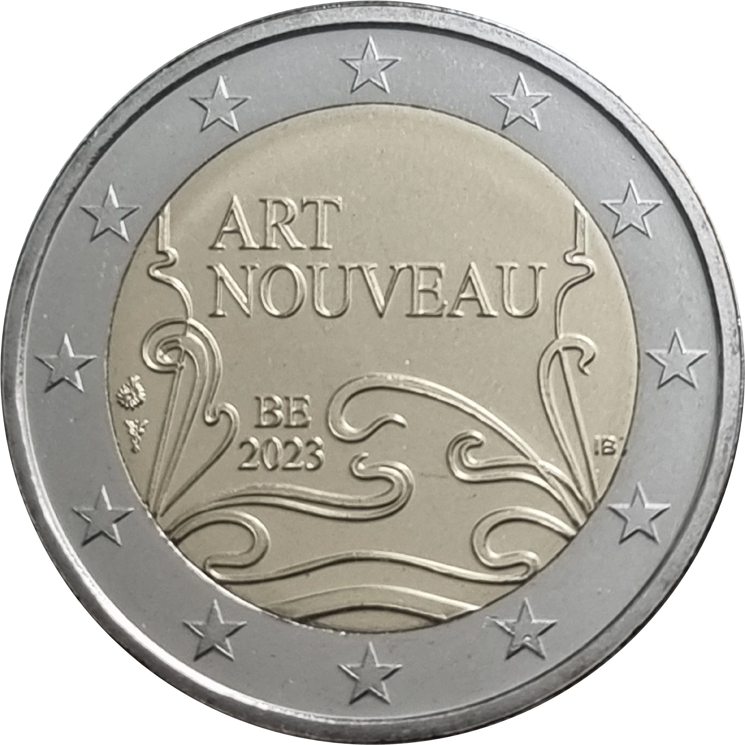 This design features a decorative detail from the facade of Victor Horta’s Art Nouveau ‘Hotel Van Eetvelde’ in Brussels, a UNESCO World Heritage site. Its curved, asymmetrical, nature-inspired lines occupy the lower half, with “ART NOUVEAU” above. The right bears the designer’s initials (Iris Bruijns). The left shows the Utrecht mintmark (mercury staff), the Belgian mint director’s mark (aster flower and Erlenmeyer flask), “BE,” and “2023.” The outer ring depicts the 12 stars of the European flag.