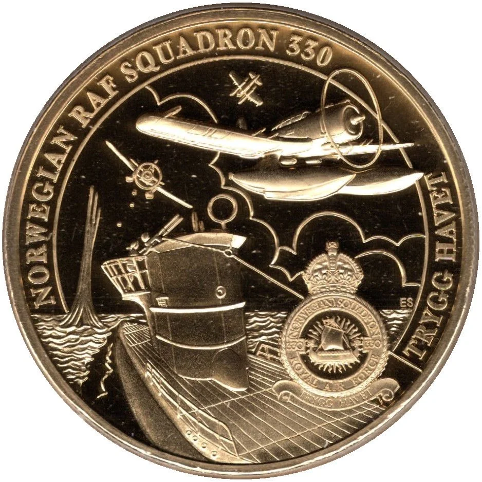 Three Northrop aircraft and a German submarine, with the Squadron 330 badge.
