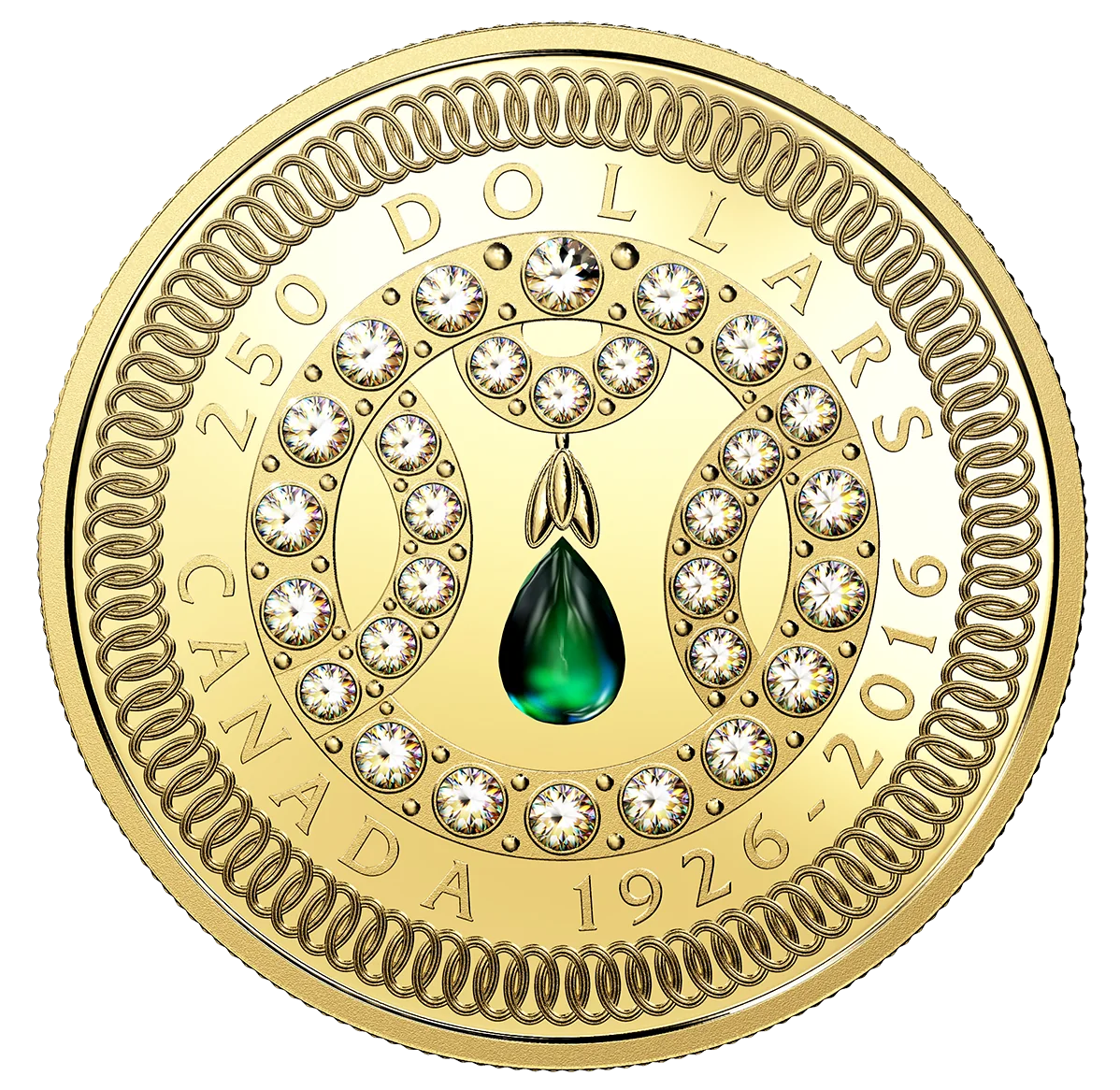 The reverse design is inspired by the Vladimir tiara, featuring its distinctive pattern of diamond circles with central emeralds. In collaboration with jeweller Steve Thompson, the Mint integrated gem-setting into the coin. The engraved border contains 90 circles marking the Queen’s 90th birthday, noted by the dual dates "1926-2016".