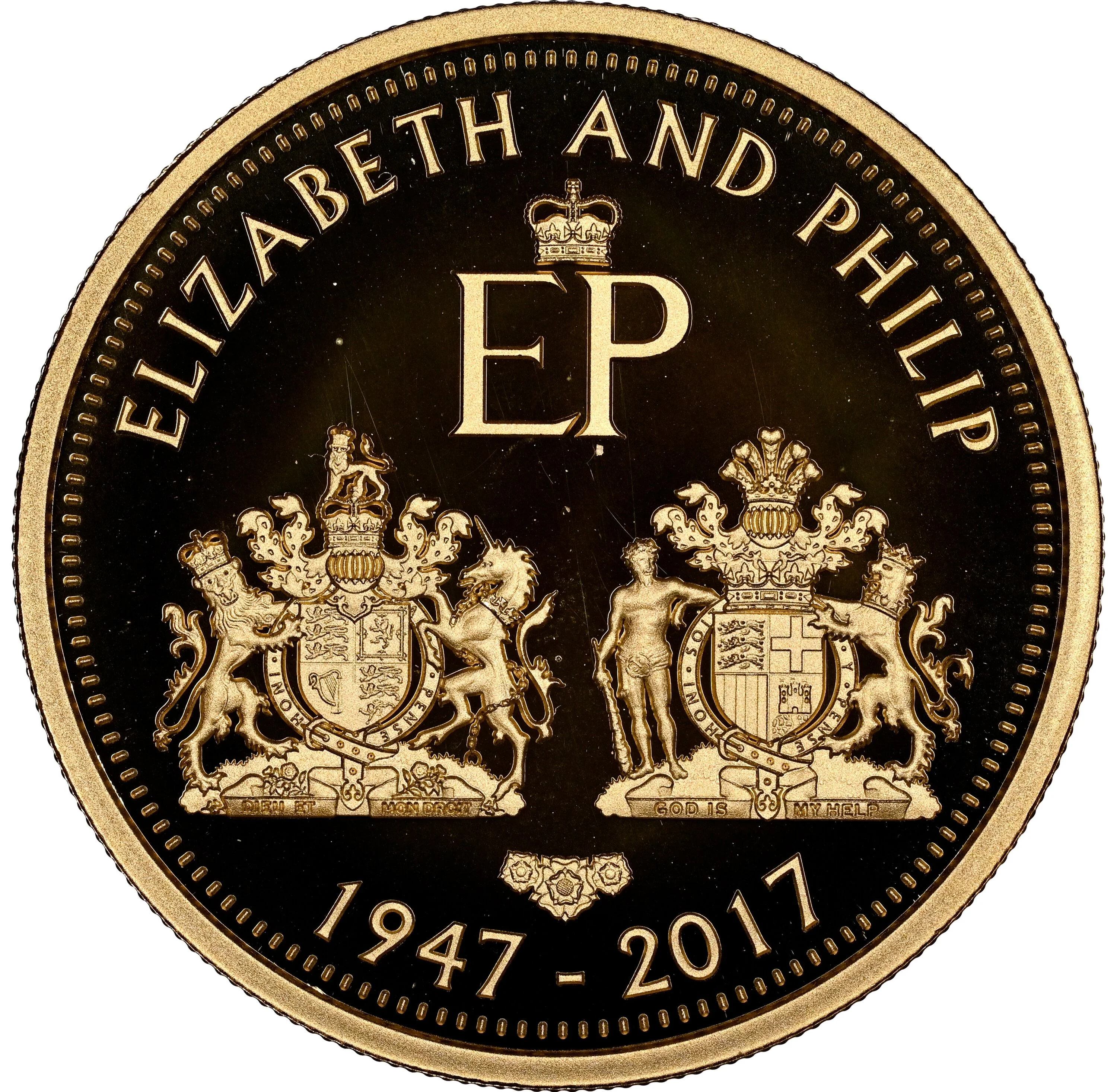 Portrait of Queen Elizabeth II and Prince Philip encircled by an inscription.