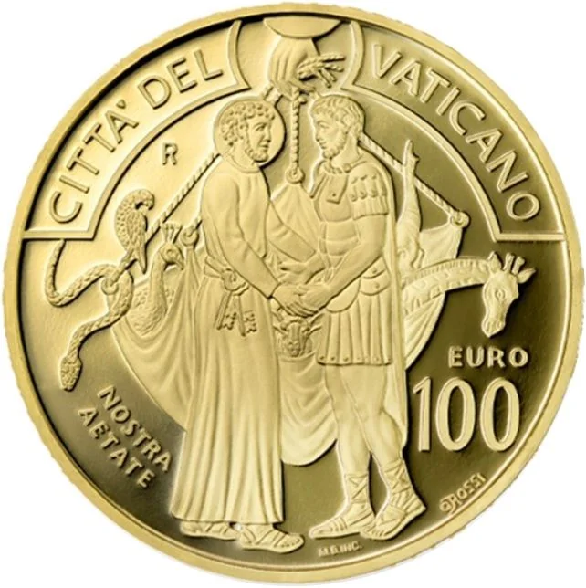 Description: Pope Francis's coat of arms: a blue shield with a mitre and crossed keys above. It features a radiant sun with the red IHS monogram (the H topped by a cross) and three black nails, an eight-pointed star for St. Joseph, and a nard flower for the Virgin Mary. The motto "MISERANDO ATQUE ELIGENDO" is below, with "FRANCISCVS PP.A.XI MMXXIII" above.