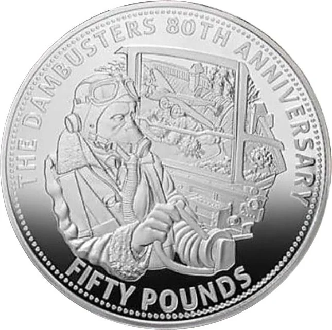 Pilot and plane design, inspired by 1955's *The Dam Busters* movie posters. Denomination below.
