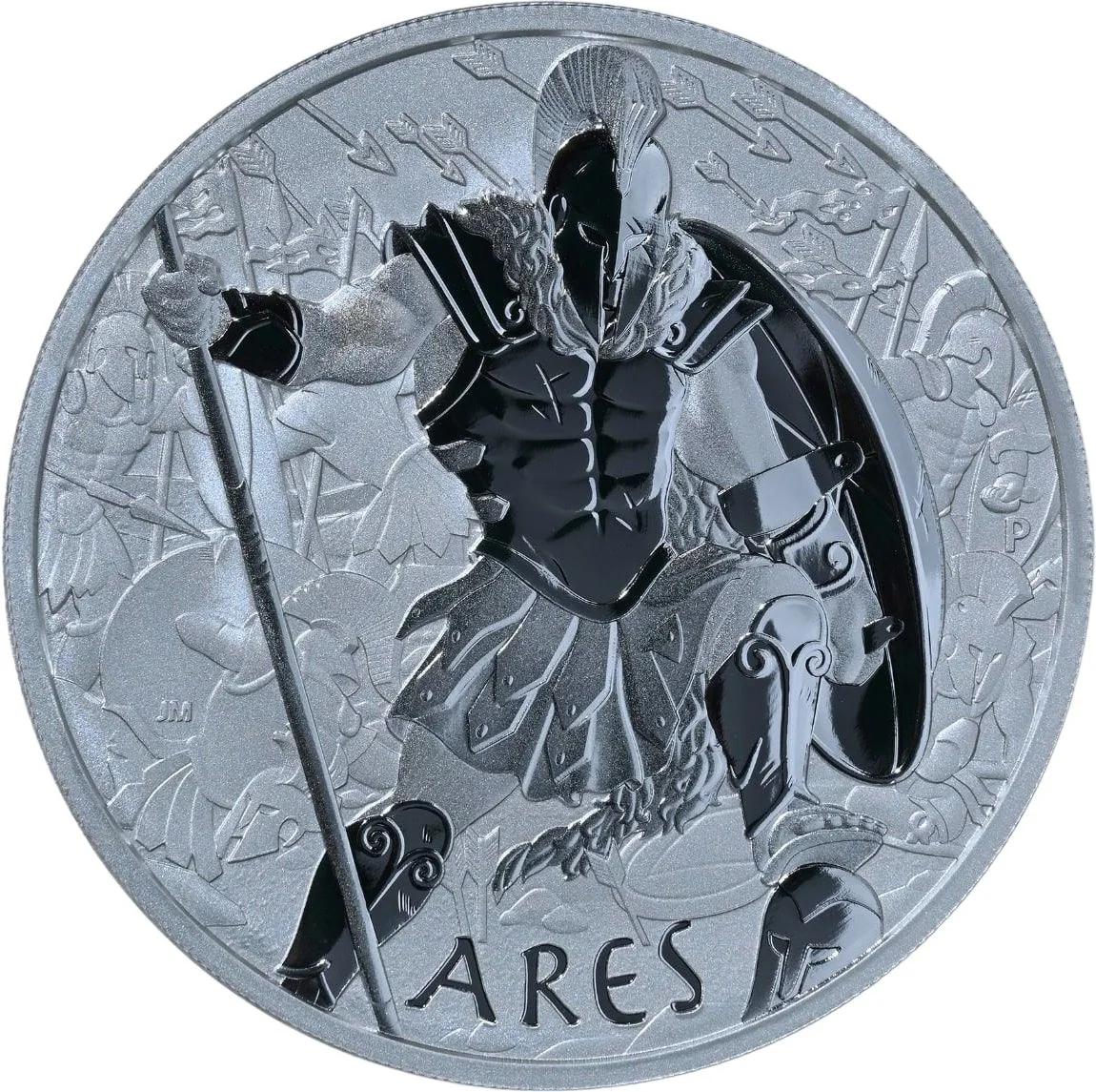 Ares in battle armor, shield raised.
