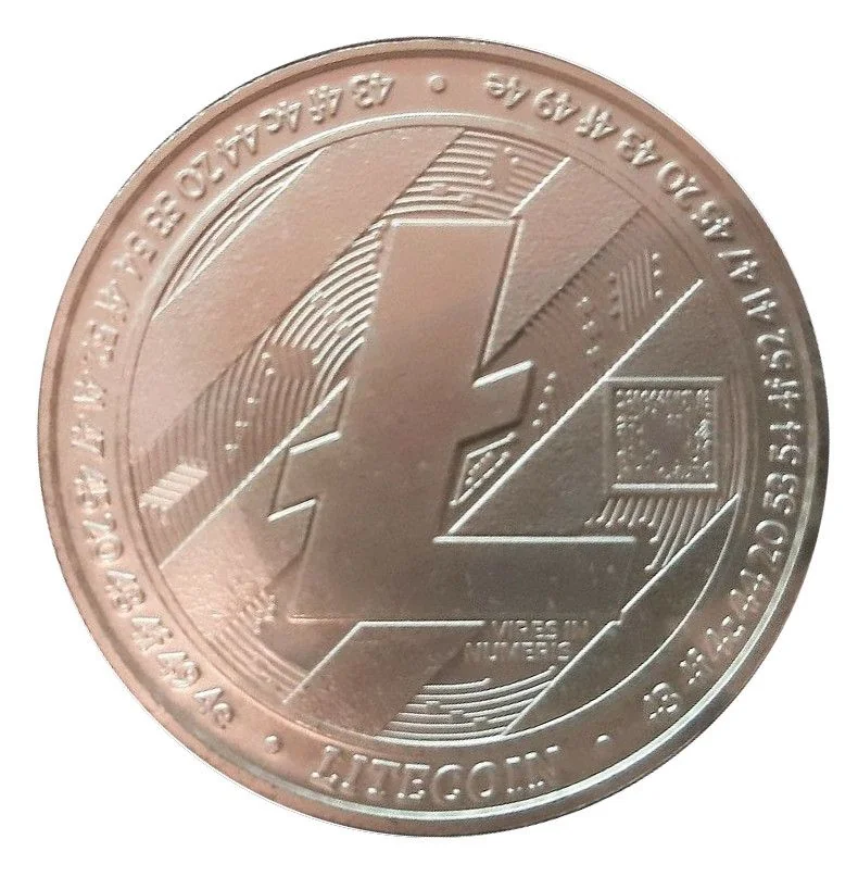 Litecoin symbol with surrounding numbers, "Litecoin" beneath.