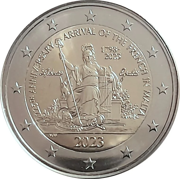 The design features a personification of the French Republic from historical letterheads. To the left is '225th ANNIVERSARY', with 'ARRIVAL OF THE FRENCH IN MALTA' arched above. '2023' is at the bottom. 'Liberté' is on the left and 'Egalité' on the right, the latter accompanied by '1798-2023'. The outer ring bears the 12 stars of the European flag.