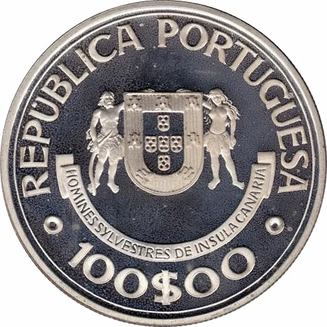 Portuguese coat of arms flanked by Guanche figures, above a ribbon with their Latin name and the value below.