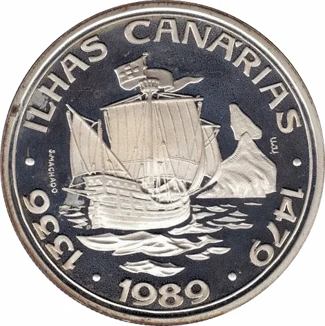 Square-rigged caravel sailing before the Canary Islands. Left: date of Portuguese discovery. Right: date dispute ended and islands retroceded to Spain. Coin's date below.