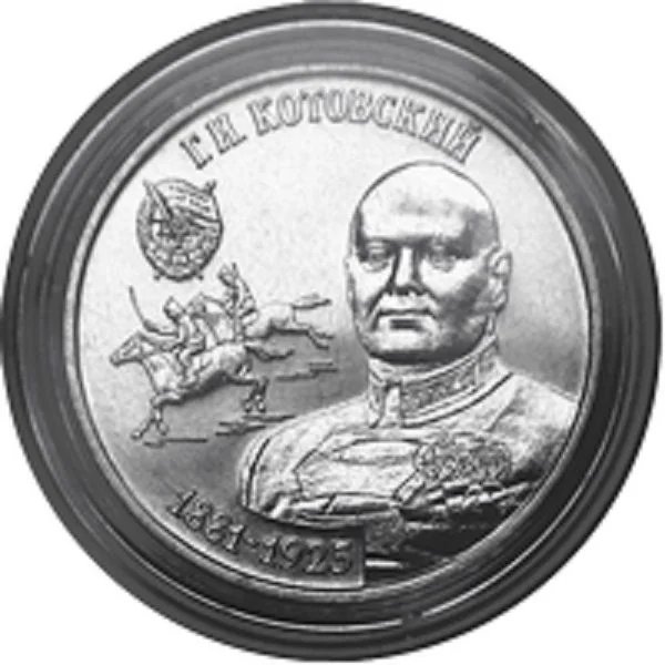 Center: G.I. Kotovsky's portrait. Left: the Order of the Red Banner, two horsemen, and his life years.