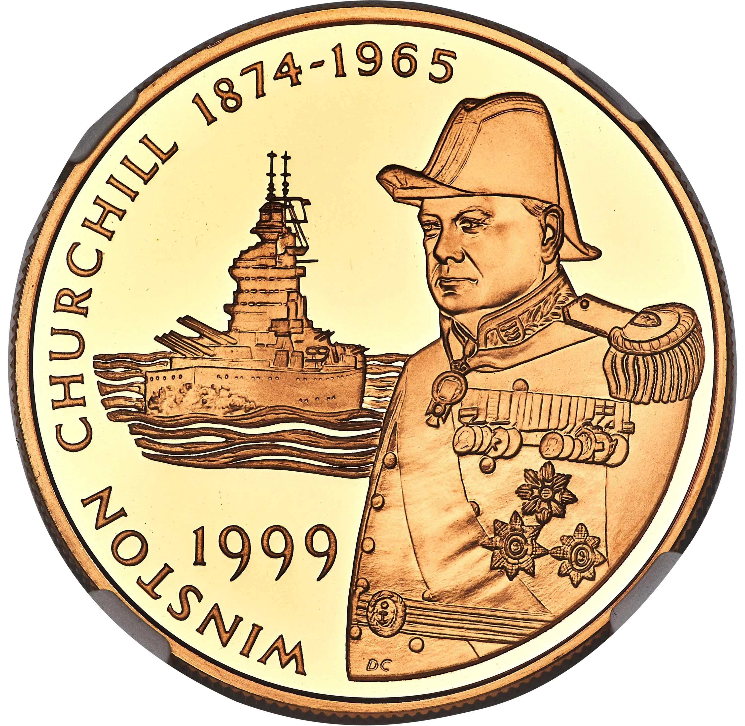 Churchill in naval uniform, left; date beneath ship.