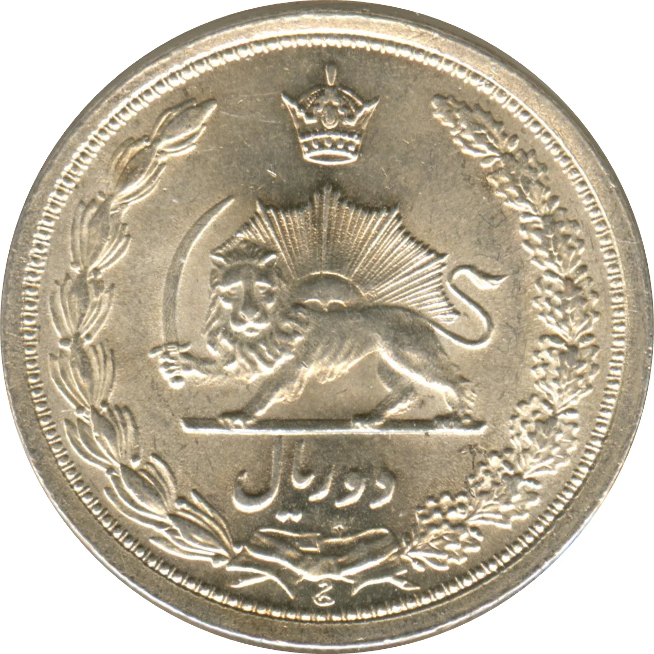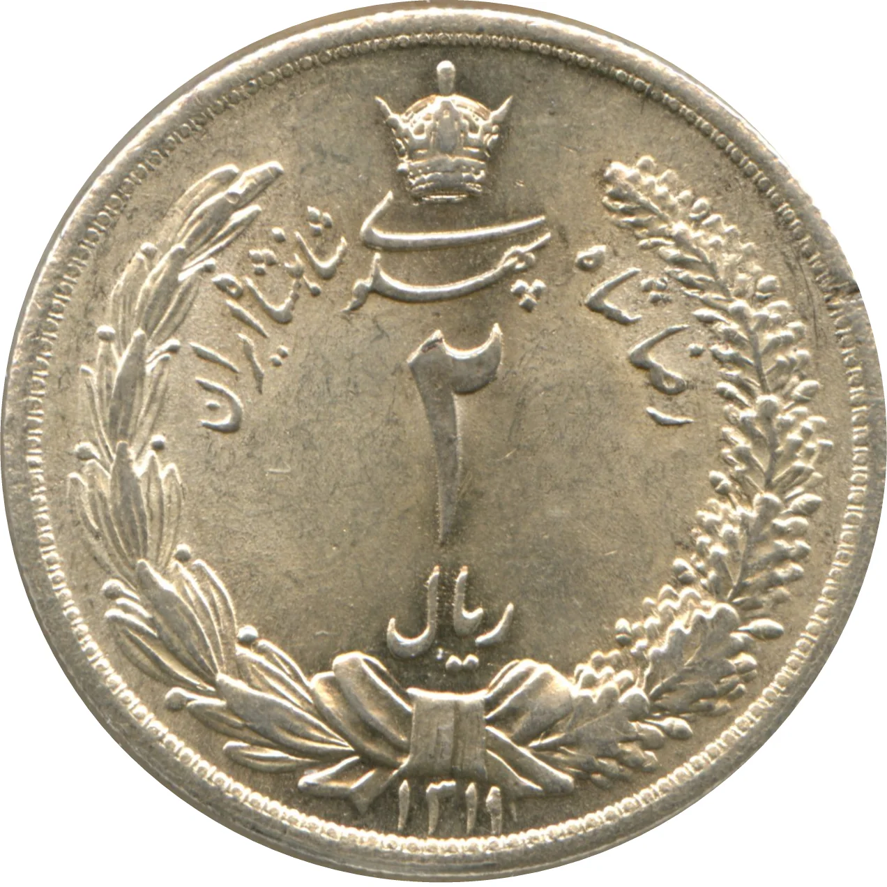 Reza Shah Pahlavi 2 Rials coin. Crown with oak and olive leaves.
