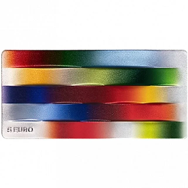 This horizontally rectangular coin reflects a choir on an open-air stage. Its counter-pressed shape creates a unified, wavy rhythm. The obverse features five multi-coloured bands, symbolising rows of singers and choral polyphony in shades from Latvian national costumes. The inscription "5 EURO" is in the lower left corner.