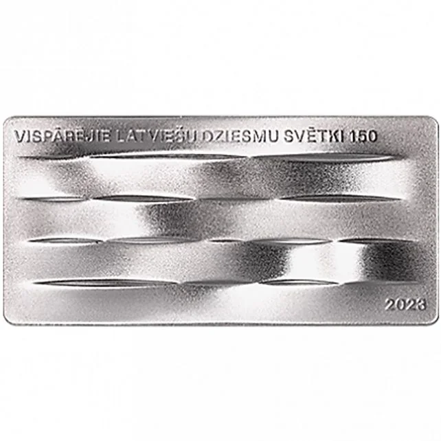 The reverse features a monochrome design with "THE NATIONWIDE LATVIAN SONG CELEBRATION 150" above and "2023" in the bottom right corner.