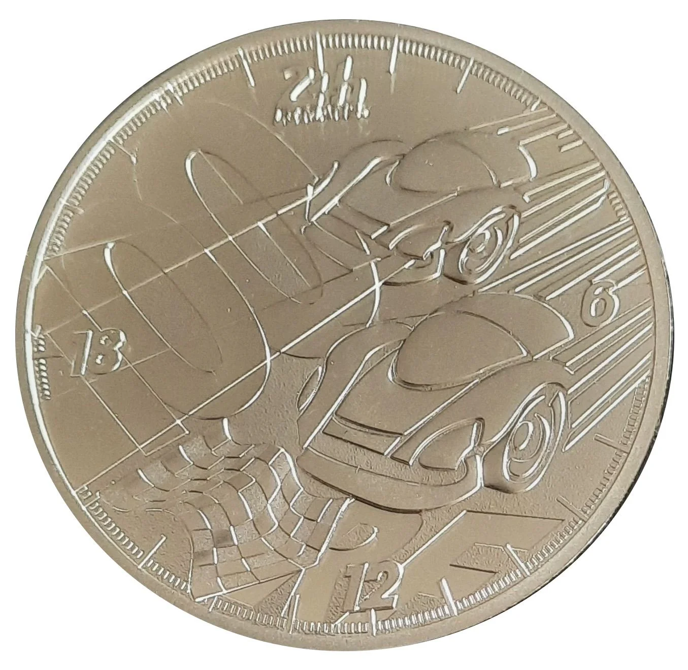 This collector coin's face shows two racing cars in a 24-hour chronometer. Its reverse-polished top creates day/night contrast, with the night car's headlights illuminating the centenary "100" and the road ahead.