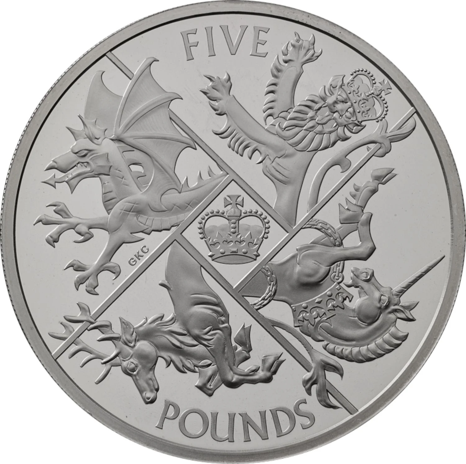 A crown encircled by the UK's four heraldic beasts: the English lion, Welsh dragon, Scottish stag, and Irish unicorn.