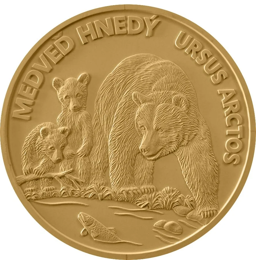 The reverse depicts a brown bear and two cubs fishing, inscribed above with "MEDVEĎ HNEDÝ" and "URSUS ARCTOS." The designer's initials "TL" (Tomáš Lamač) appear at the lower right.