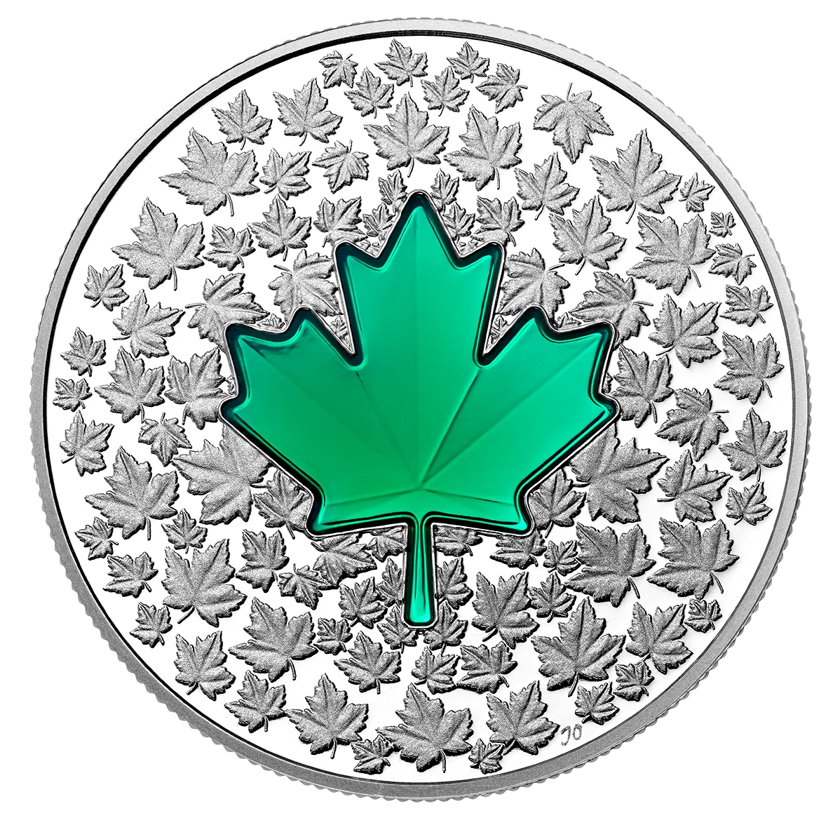 Large maple leaf encircled by smaller ones.