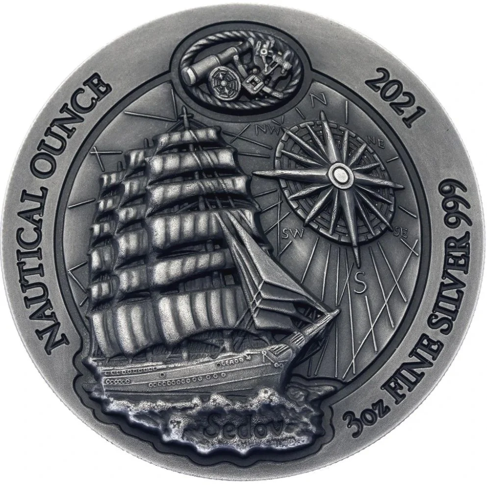 Sedov left, compass rose upper right, nautical instruments upper center.