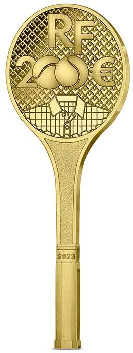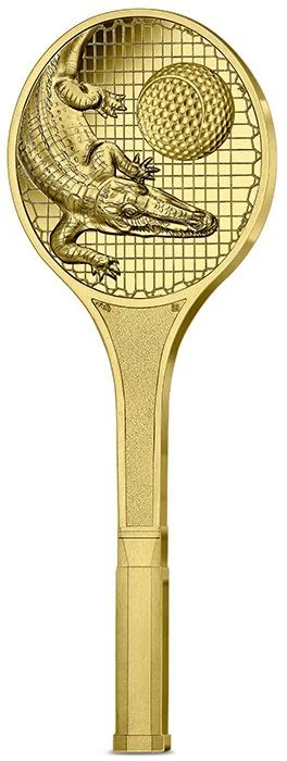 The handle mimics a real racket with engraved details. The strings depict Lacoste's crocodile emblem and a tennis ball with a golf ball texture, honoring his champion wife.