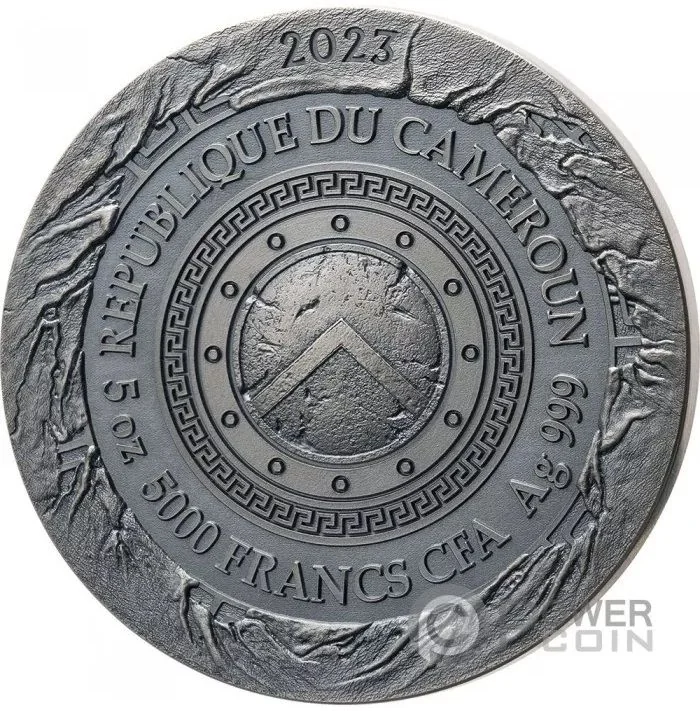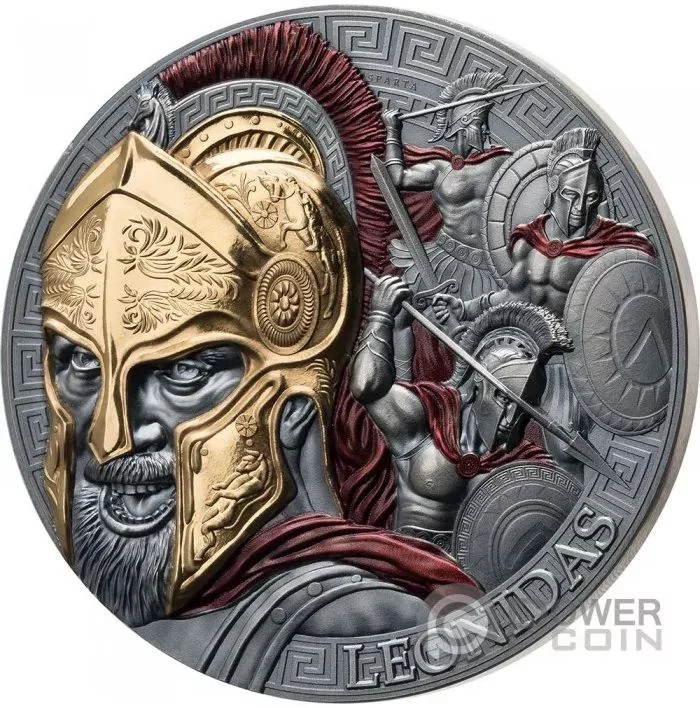 Leonidas' helmeted head faces left; three Spartans battle with weapons and shields at right.