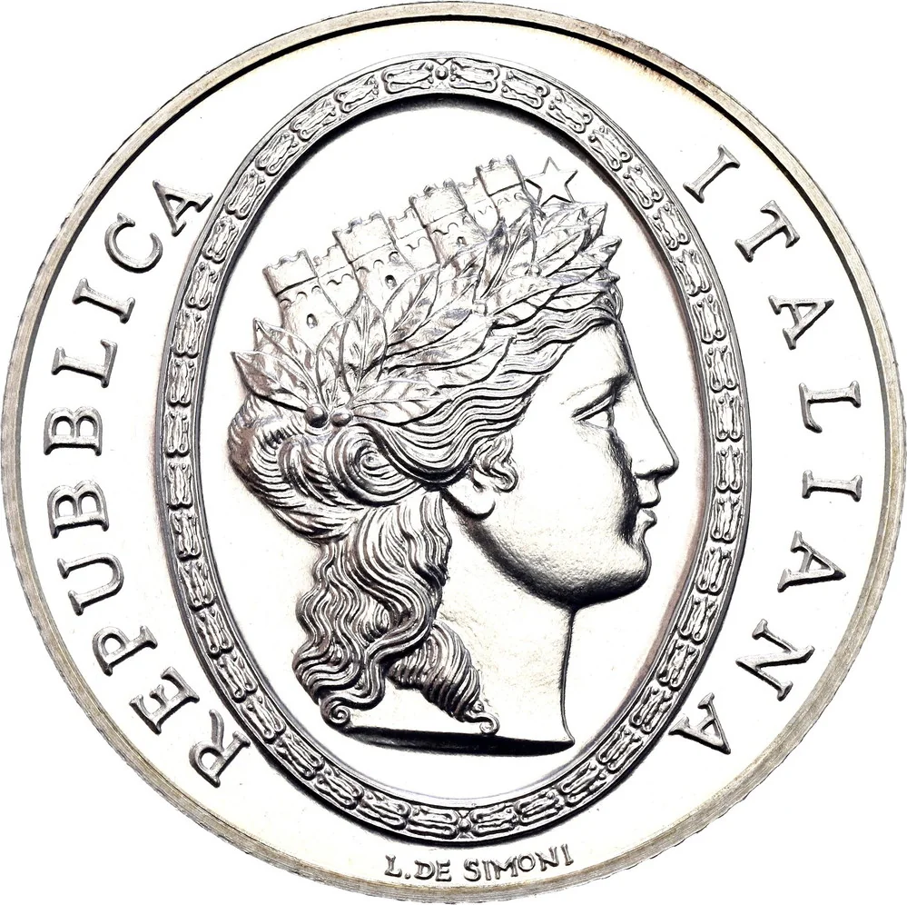 Italy's towered head, as on the 1944 50 and 100 Lire notes, inside an oval. Author's name below.