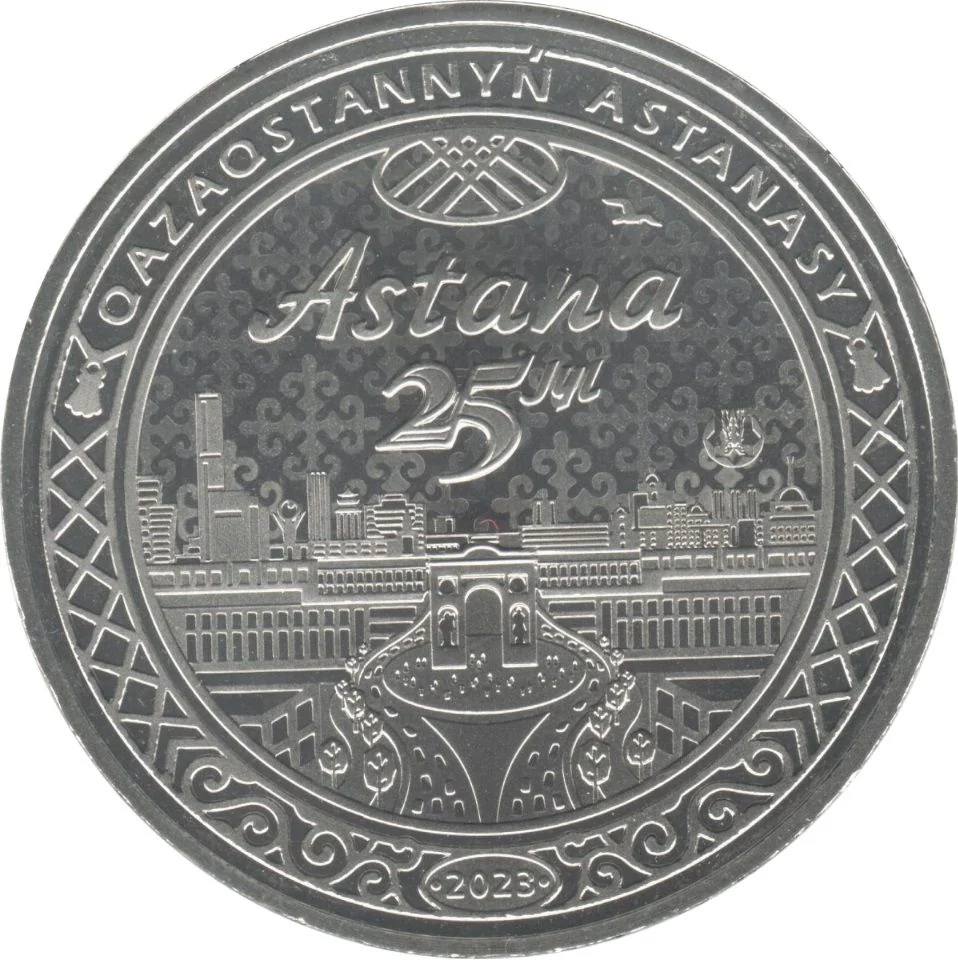 Description: A stylized city panorama with national ornament features the central inscription "Astana 25 jүl" and the National Bank logo on the right. "QAZAQSTANNҮŃ ASTANASҮ" is inscribed around the circumference, with the coin's issue year below.