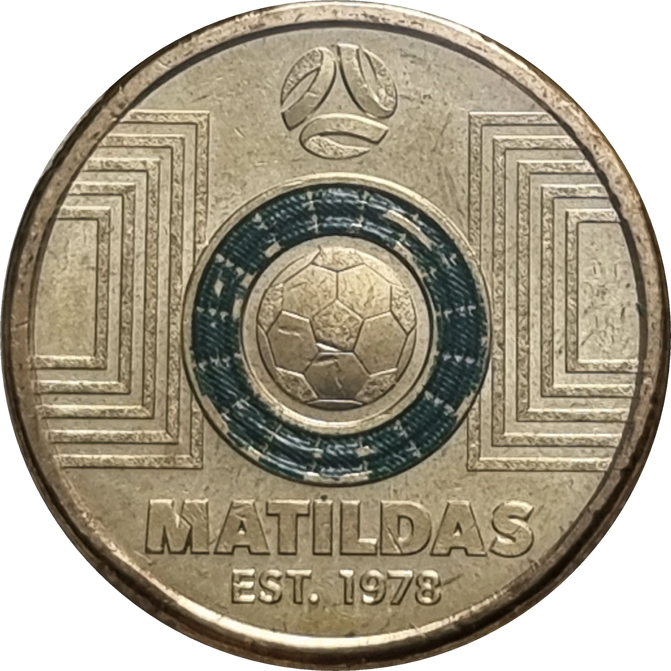 A football within a dark green ring, flanked by lines representing a field, under the Football Federation Australia logo.