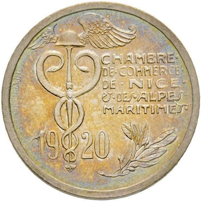 Description: Caduceus left of transmitter, foot dividing date, olive branch above in five lines.
