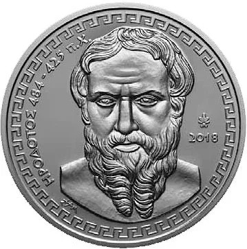 Portrait of Herodotus based on an ancient bust. "HERODOTUS 484-425 B.C." is along the left rim, with the 2018 issue year and Greek Mint mark to the right.