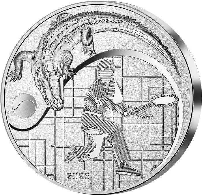 The coin features three zones resembling a tennis ball's aerial view, textured like crocodile skin, polo shirt piqué, and racket stringing. Its face value centers a golf ball as the zero, honoring champion Simone Thion de La Chaume.