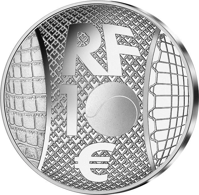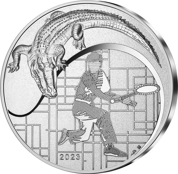 The coin features three zones resembling a tennis ball's aerial view, textured like crocodile skin, polo shirt piqué, and racket stringing. Its face value centers a golf ball as the zero, honoring champion Simone Thion de La Chaume.