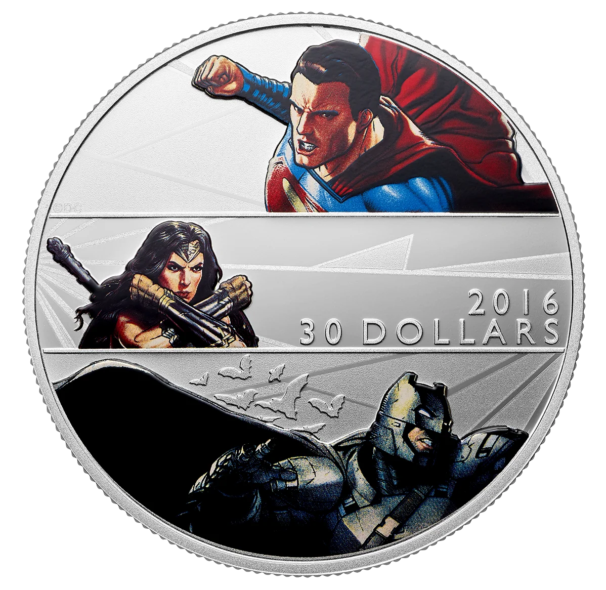 Superman, Wonder Woman, and Batman colorized images with centered date and value.
