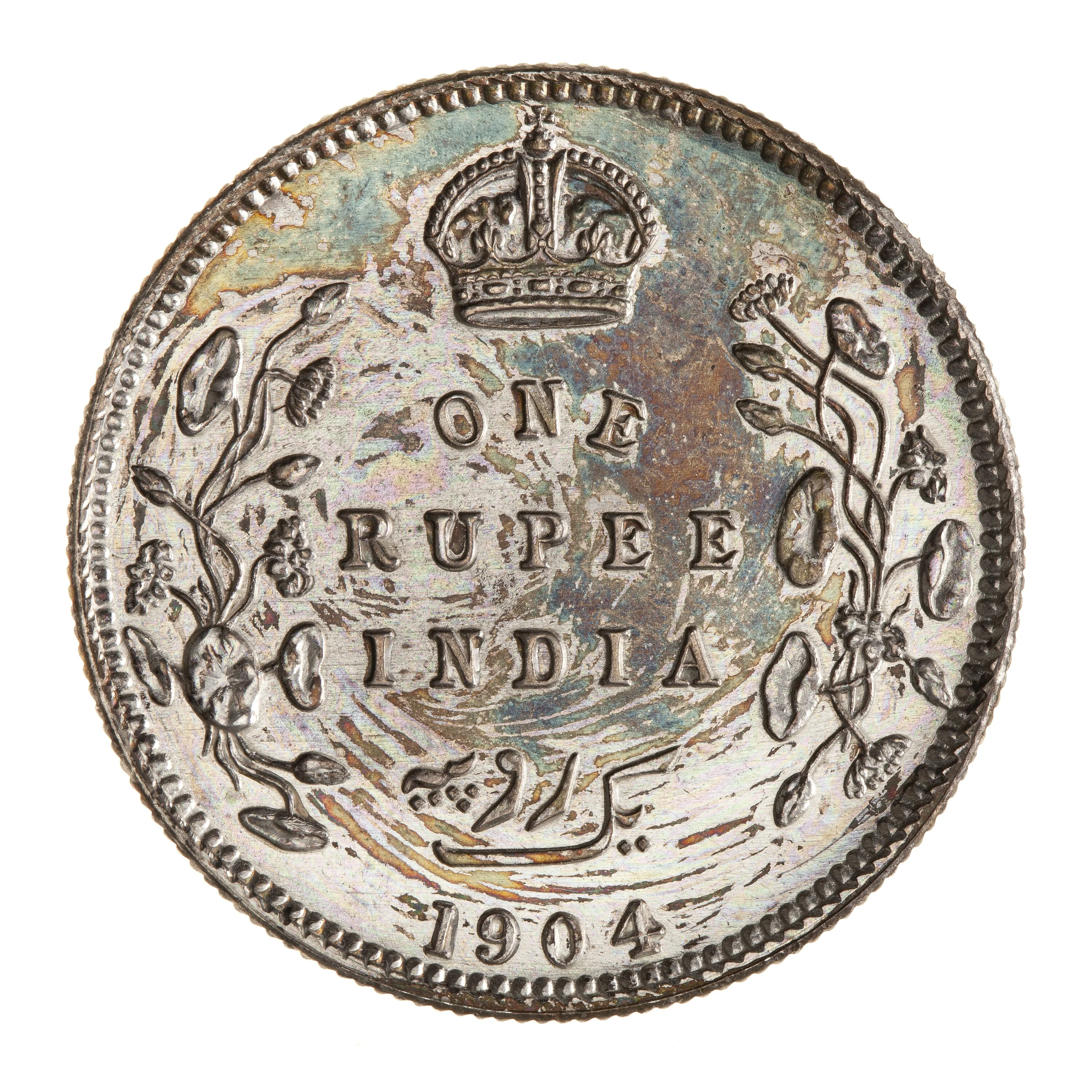 English and Urdu value: "One rupee." Date below, lotus sprays on sides, crown above, within a raised toothed border.