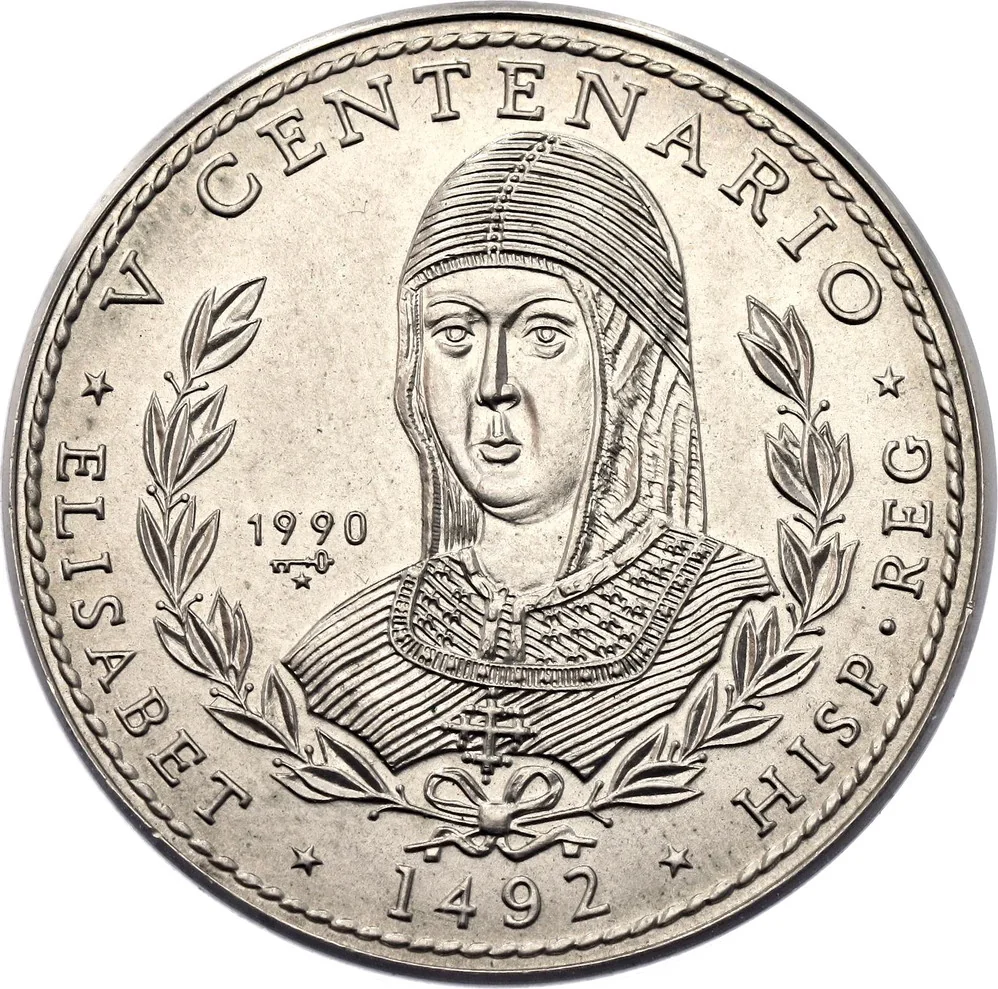 Portrait of Queen Isabella within a wreath, name below. Event and date above and right; mintmark and issue left. Rope border near edge.